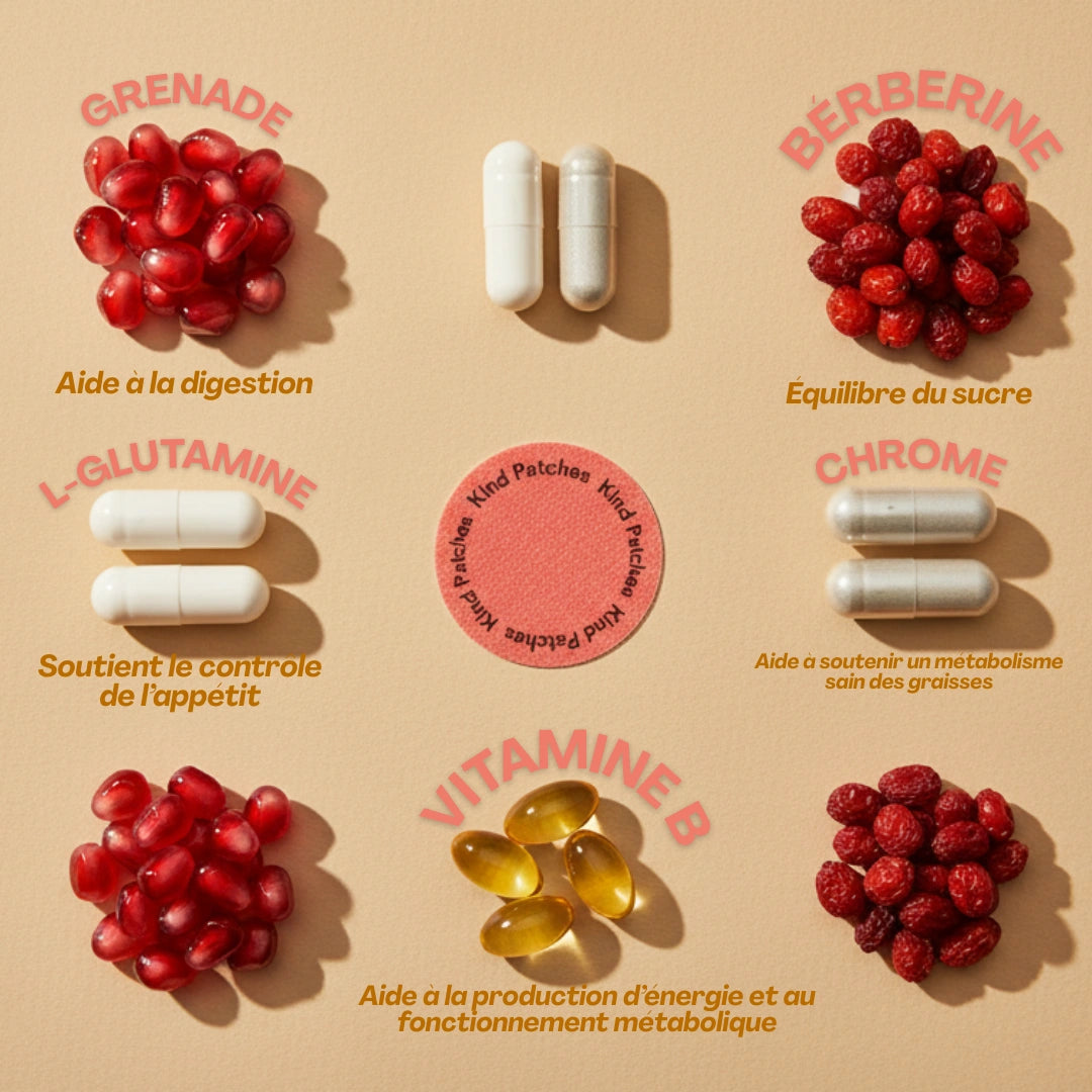 Nos patchs GLP-1 sont formulés à partir d'ingrédients soigneusement étudiés pour vous aider à atteindre vos objectifs de santé. Parmi les composants actifs, vous trouverez :